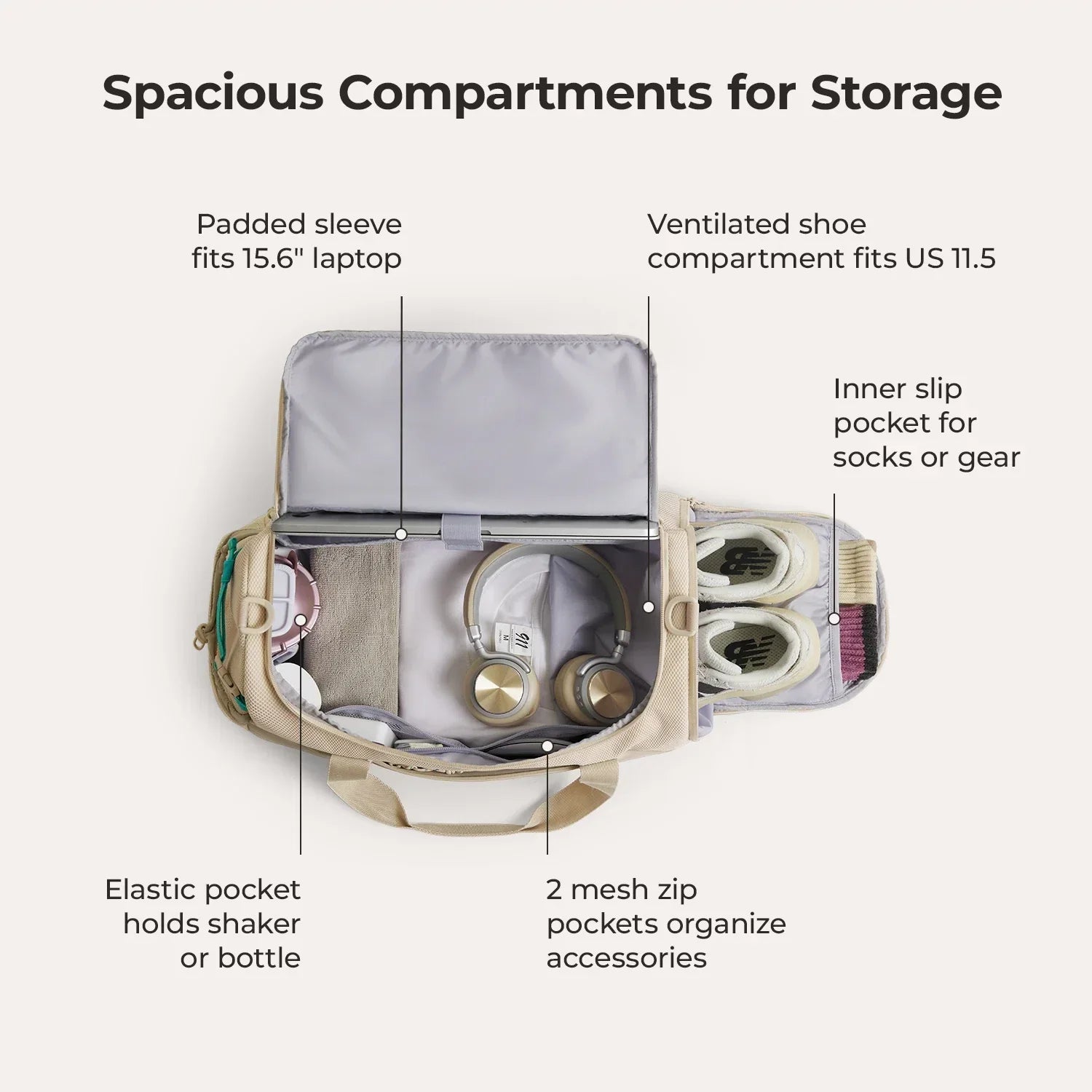 Diese stilvolle beige Duffel Bag mit 36 Litern Fassungsvermögen ist der perfekte Begleiter für aktive Tage, Wochenendtrips oder den Besuch im Fitnessstudio. Mit durchdachtem Design, geräumigem Hauptfach, atmungsaktivem Schuhfach und mehreren praktischen Fächern sorgt diese Tasche für eine organisierte und komfortable Reise.